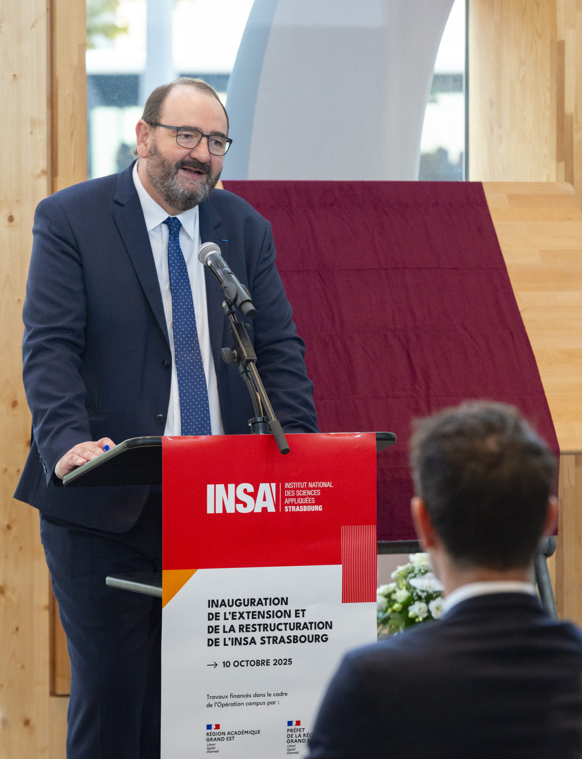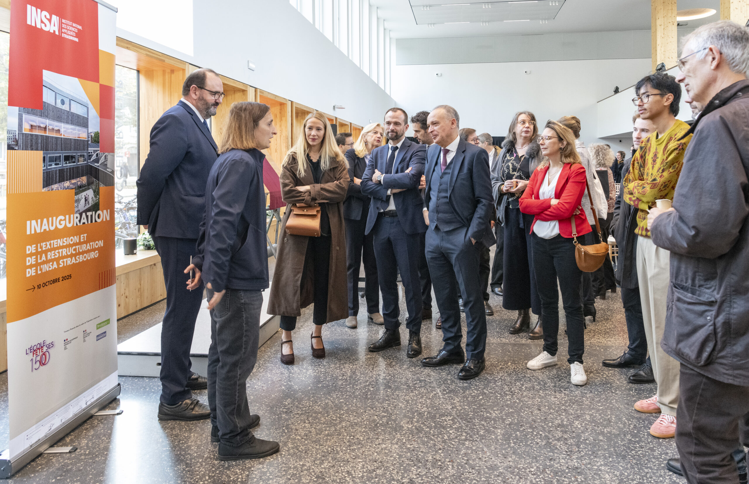 Le 10 octobre 2025, l’INSA Strasbourg a célébré la fin des travaux lors d’une cérémonie organisée dans la salle d’exposition de l’école. À cette occasion, plusieurs personnalités se sont exprimées. Romuald Boné, directeur de l’INSA Strasbourg, et Marc Renner, directeur de l’école de 2009 à 2019, ont ouvert la série de discours, suivis par Pierre Schruoffeneger, président du Conseil d’administration. Les financeurs de l’opération ont ensuite pris la parole : Irène Weiss, conseillère régionale et vice-présidente de la commission Enseignement supérieur, représentant la Région Grand Est, Pia Imbs, présidente de l’Eurométropole de Strasbourg, et Samuel Bouju, secrétaire général pour les affaires régionales et européennes (SGARE) de la région Grand Est, représentant le préfet du Bas-Rhin et de la région.